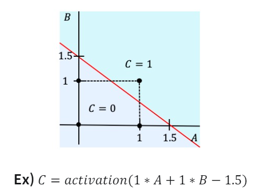 위 그래프와 같이 퍼셉트론에 AND gate를 적용 시켰을 때 선형 그래프를 기준으로 위쪽으로 해당하는 수들의 조합은 모두 1이 출력되고 아래쪽으로 해당하는 수들의 조합은 모두 0으로 출력되는 것을 나타내고 있다.