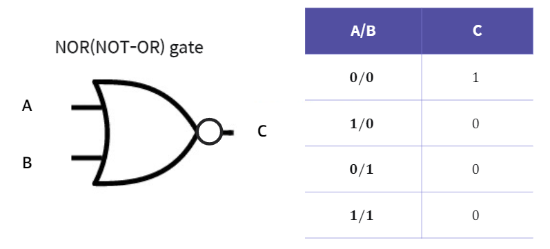NOR gate 역시 OR gate 앞에 NOT을 뜻하는 원형기호가 붙어있기 때문에 기존의 OR gate가 출력하던 출력값에서 반대되는 값을 출력하는 것을 도표를 통해 확인 할 수 있다.