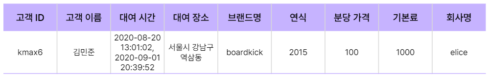 데이터 베이스에 저장된 대여시간이 한 속성 값에 두개가 입력되어 있습니다.