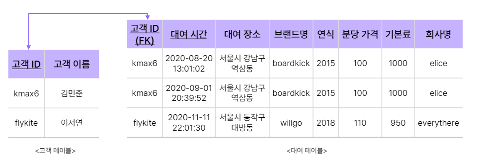 고객 테이블과 대여 테이블로 분리하여 부분 함수 종속을 제거