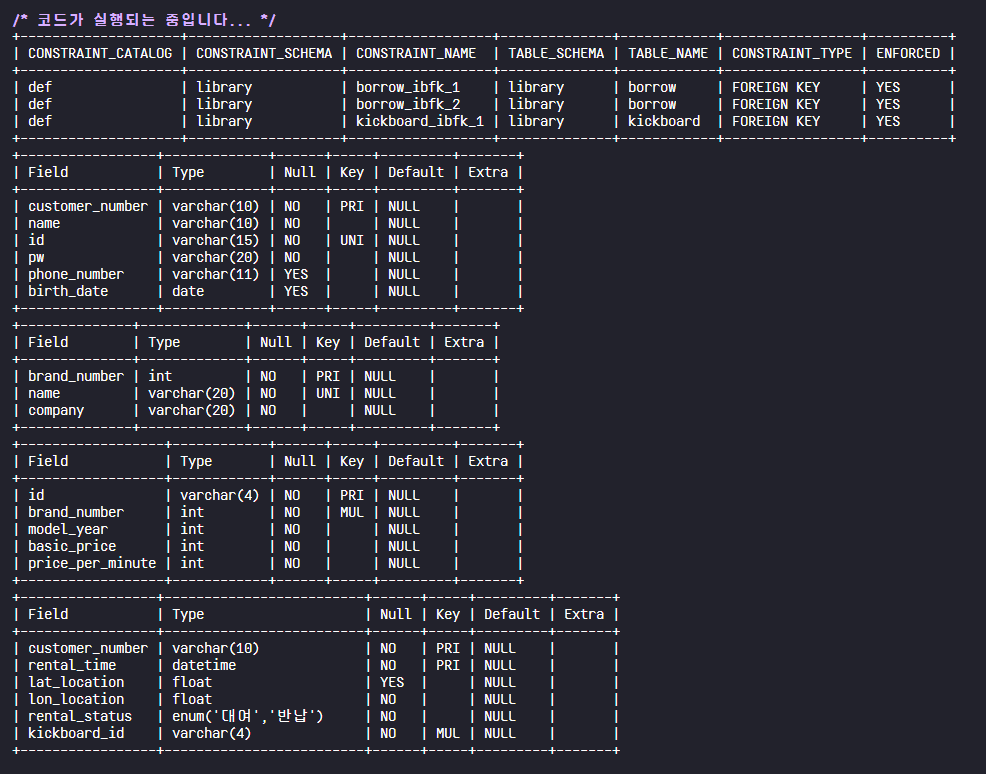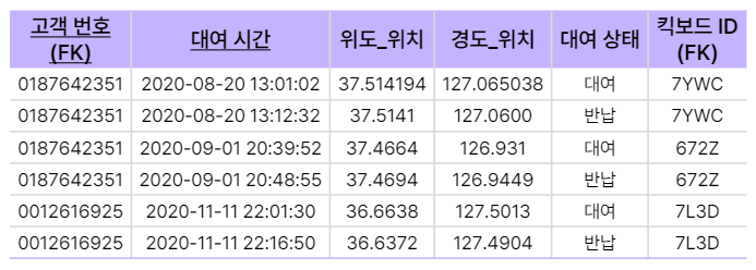 -- 3차 정규화 설정된 테이블을 수정하여 최종 형태의 공유 킥보드 DB를 만드세요.