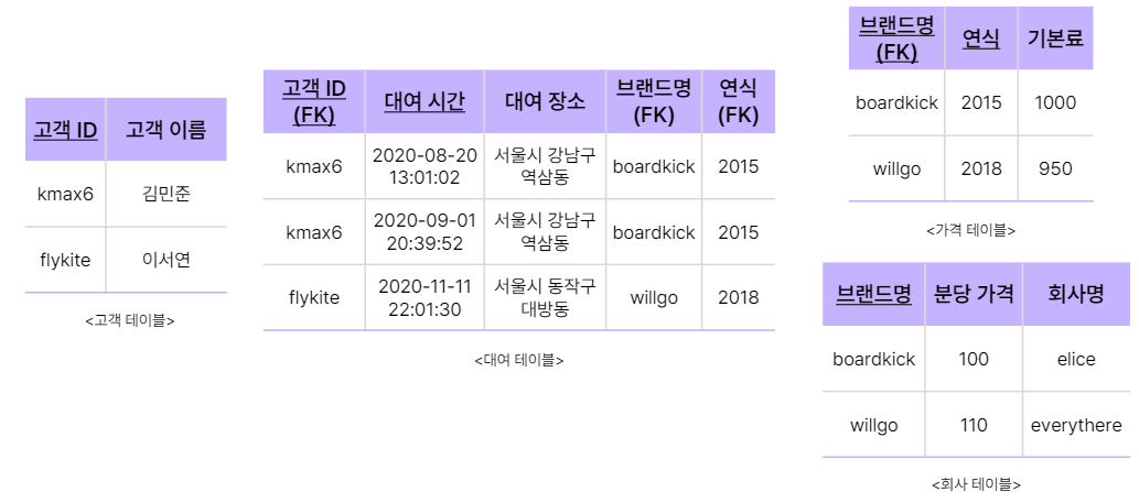 앞서 정규화 과정을 통해 각각의 데이터베이스에서 발생하는 오류와 정규화를 통해 해결하는 방법을 공부하고 위 사진과 같이 고객테이블, 대여 테이블, 가격 테이블, 회사 테이블로 나누었습니다.