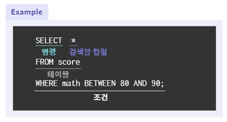 기타 연산자의 연산자 중 BETWEEN을 사용한 코드를 살펴보면 WHERE 조건문 내에 사용되고 있으며, math 컬럼의 데이터 중 점수가 80점과 90점 사이의 값을 검색합니다.
