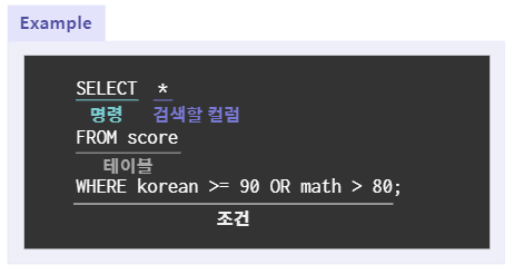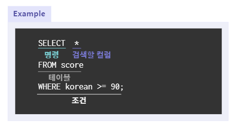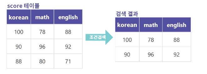 위 코드를 통해 비교 연산자를 사용하여 score테이블에서 국어(korean)성적이 90점 이상인 값을 검색하기 위해 어떻게 작성하는 지를 알 수 있습니다.