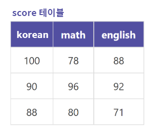 위 데이터 테이블처럼 korean, math, english라는 컬럼을 가지고 있으며, 각각의 컬럼은 3개의 점수를 가지고 있는 것을 확인할 수 있습니다.