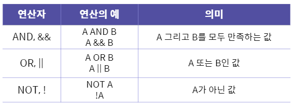 복합조건 연산자란 두 개 이상의 논리 연산자를 사용하여 표현한 수식에서 논리 연산자들을 이르는 말을 코드 내에서 사용할 수 있도록 나타낸 것이며, 각 연산자들을 위 표를 통해 확인할 수 있습니다.