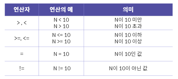 위에서 설명한 조건을 작성하기 위해 비교 연산자라는 개념에 대해 알아야 합니다. 비교 연산자란 두 수를 비교할 때 사용하는 연산자로써 이상, 이하, 초과, 미만을 기호로 나타낸 것입니다.