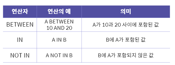 그리고 위에서 설명한 각각의 연산자 이외에 위 표처럼 BETWEEN, IN, NOT IN 연산자가 있습니다.