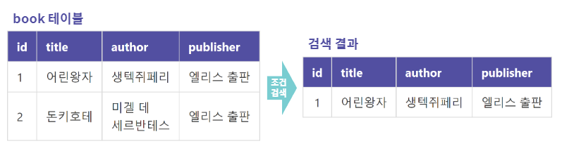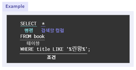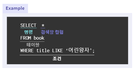 위 코드처럼 조건을 작성하는 줄에 LIKE를 넣어 book 테이블에서 제목(title)이 '어린왕자'인 책을 검색할 수 있습니다.