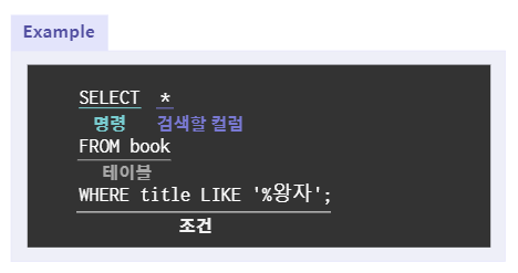 LIKE 명령의 경우 검색 조건을 '%왕자'처럼 표기하여 book 테이블에서 제목(title)이 '왕자'로 끝나는 책을 검색할 수도 있습니다.